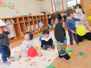 ころころ ぽーん!(1歳児) 2023.04.25 スタッフブログ 1歳児さんの保育室は、たーくさんの風船と、たーくさんのカラーボールでいっぱい!! ボールを集めて先生やお友だちに「どうぞー」と渡したり、風船を追いかけたり、ポーンと投げたり・・・ いろんな楽しみ方を見つけて、思い思いに楽しんでいました! スタッフブログ 今日の給食前の記事 今日の給食次の記事