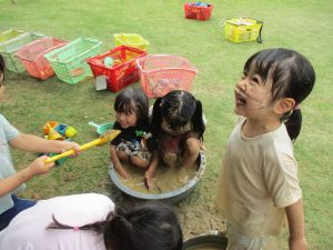 どろんこ遊び(年中組) 2024.06.6 スタッフブログ 年中さんの泥んこ遊びday! 汚れるの嫌だな…濡れるの嫌だな…と躊躇していた子も、次第に開放されて、どろんこ、どろんこ。 「楽しかったー!」の後は、どろんこ服の洗濯も頑張りました! スタッフブログ ふれあい遊び参観日前の記事 今日の給食次の記事