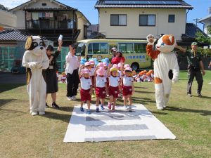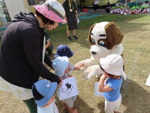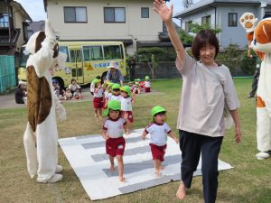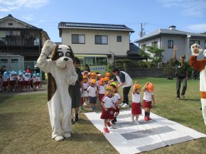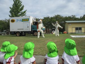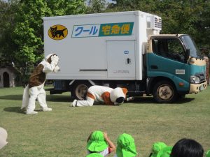 配達のお兄さん、いぬさん、ねこちゃんの名演技に、子ども達は「ダメーーー!」「あぶない!!」と大声で参加し、安全な遊び方やお約束についてしっかり考えていました。