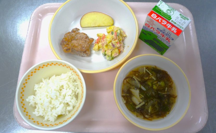 今日の給食 2025.10.17 今日の給食 10月17日(金) ・ごはん ・鶏肉の竜田揚げ ・さつま芋のコロコロサラダ ・もずくのみそ汁 ・りんご ・牛乳 皆大好きな竜田揚げ!さつま芋のサラダもほんのり甘くて食べやすいです! 今日の給食 今日の給食前の記事