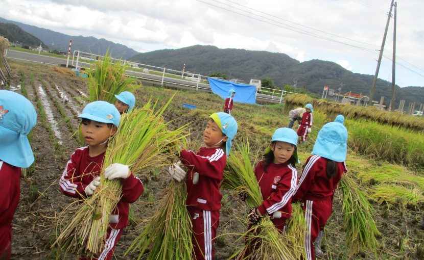 年長さんは、田んぼのお世話をしてくださった地域の方からカマの使い方を教えていただき、カマを使って稲刈りに挑戦しました。