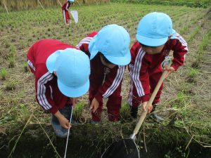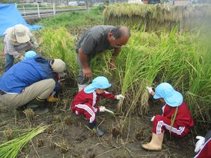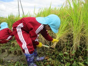 年長さんは、田んぼのお世話をしてくださった地域の方からカマの使い方を教えていただき、カマを使って稲刈りに挑戦しました。