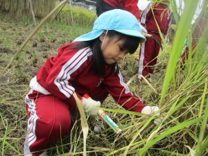 最初はなかなか思うようにカマが使えず苦戦していましたが、だんだんとコツをつかんで、一束一束丁寧に刈り取ることができました。