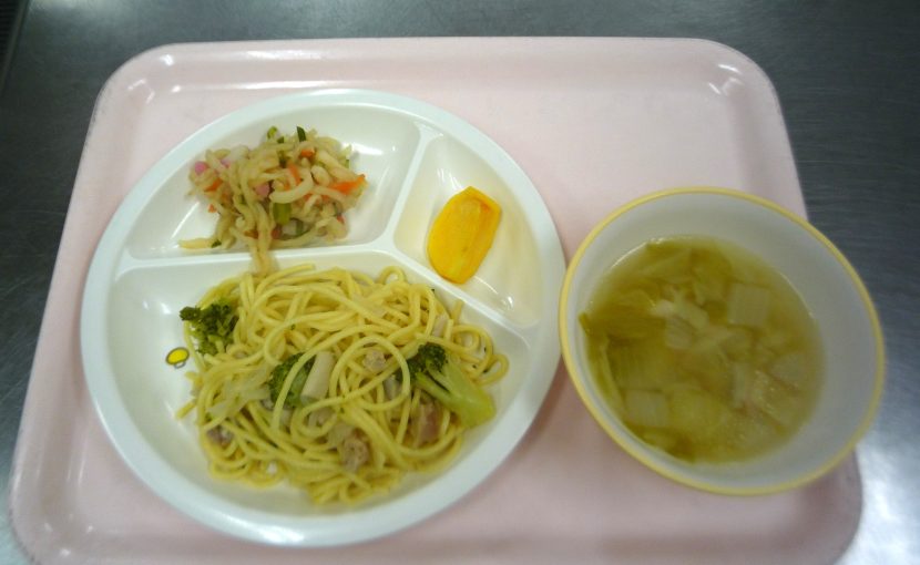 今日の給食 2025.11.6 今日の給食 11月6日(木) ・和風スパゲティ ・切干大根の酢の物 ・チキンスープ ・柿 切干大根の歯ごたえが楽しい酢の物です。和風スパゲティも食べやすい味付けになっています。 今日の給食 今日の給食前の記事