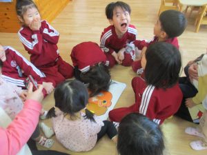 ひよこ組さんもきりん組さんも、大笑いの福笑い交流会でした!!!