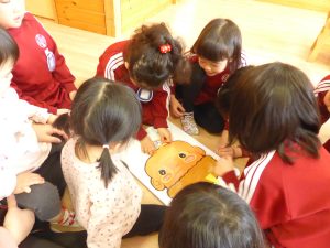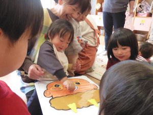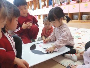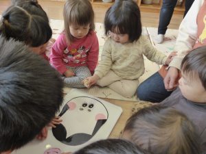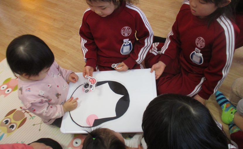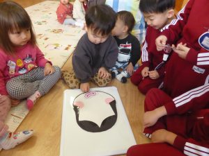 きりん組とひよこ組のお友だちが、「福笑い」で一緒に遊びました。