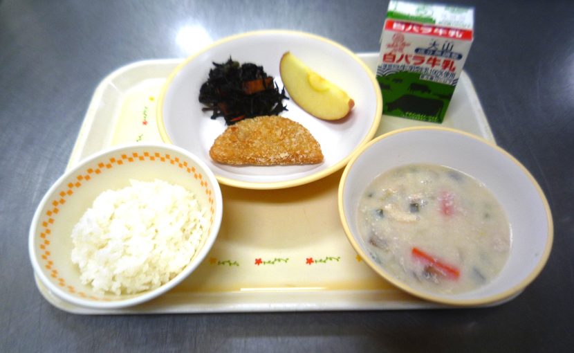 今日の給食 2026.01.26 今日の給食 1月26日(月) ・ごはん ・ハムカツ ・ひじきの煮物 ・豆乳豚汁 ・りんご ・牛乳 今日のハムカツは、小麦、乳、卵不使用で、衣はポテトフレーク等が使用されています。サックサクで美味しいです 今日の給食 今日の給食前の記事