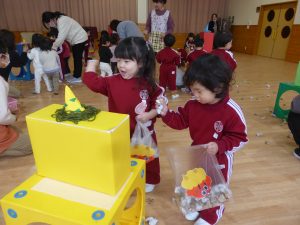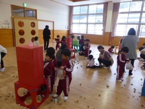 パネルシアターやダンス、○×クイズなどで盛り上がった後は、3歳以上児さんの豆まき大会!