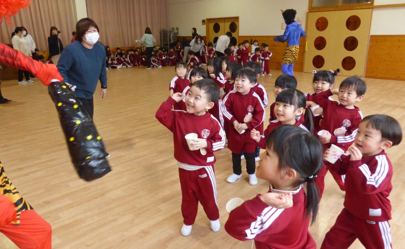 パネルシアターやダンス、○×クイズなどで盛り上がった後は、3歳以上児さんの豆まき大会!