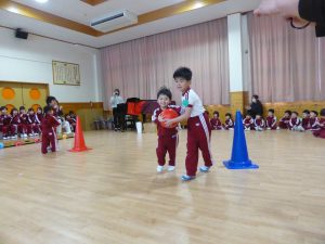 まずは年長さんと2歳児・1歳児・満1歳児クラスのお友だちで「ボール運び競争」です。